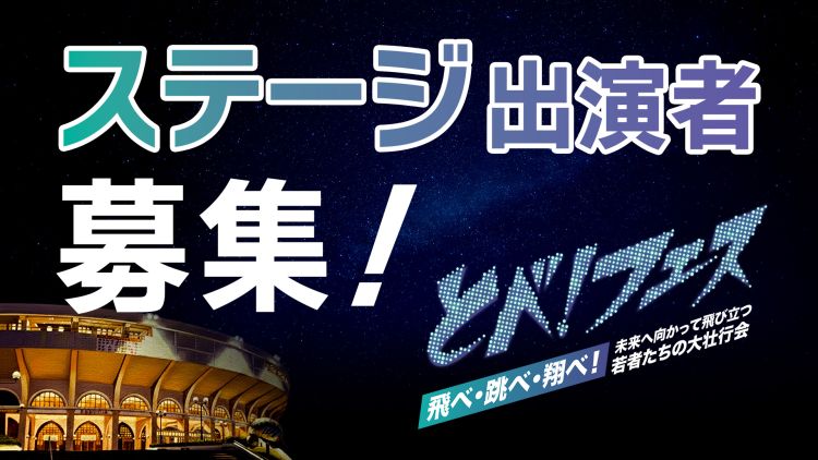 WEB応募フォーム 必要事項をご確認の上、下部にある「送信する」ボタンを押してください。 「とべ!フェス」ステージ出演者募集!3/18に長崎ビッグNスタジアムで開催される 「とべ!フェス」のステージイベントに 出演してくれる団体を募集します! この春、進学や就職など、様々な理由で 長崎を離れる若者たち、 この機会に、あなたが打ち込んできたものを 長崎ビッグNスタジアムの「とべ!フェス」の ステージで披露しませんか? 在校生と卒業生、一緒に 最後のステージを披露したいー 今年一緒に卒業した仲間と 長崎で最後に何かしたいー そんなグループを募集します。 <募集対象者> 15歳~24歳 または 現在学生(高校・大学・専門学校 等) の方 <応募締切> 2026年3月8日(日)23:59 <注意事項> ・午後6時~7時までの ステージイベントでの披露となります。 ・このステージの テレビ・ラジオ放送はありません。 ・応募者へは後日、個別に ご連絡させていただきます。 ・応募者多数の場合、 出演団体を選定させていただきます。 <お問い合わせ> NBC長崎放送 本社営業部 tv-eigyo@nbc-nagasaki.co.jp ----------------------------------------------------- とべ!フェス -飛べ・跳べ・翔べ! 未来へ向かって飛び立つ若者たちの大壮行会- ----------------------------------------------------- 【日時】2026年3月18日(水) 16時開場 ※20時30分閉場予定 【会場】長崎ビッグNスタジアム (長崎県営野球場) ※入場無料・出入り自由 【主催】NBC長崎放送 とべ!フェス WEB氏名(必須)フリガナ<氏名>(必須)年齢(必須)15歳16歳17歳18歳19歳20歳21歳22歳23歳24歳25歳26歳27歳28歳29歳30歳31歳32歳33歳34歳35歳36歳37歳38歳39歳40歳41歳42歳43歳44歳45歳46歳47歳48歳49歳50歳51歳52歳53歳54歳55歳56歳57歳58歳59歳60歳61歳62歳63歳64歳65歳66歳67歳68歳69歳70歳71歳72歳73歳74歳75歳76歳77歳78歳79歳80歳81歳82歳83歳84歳85歳86歳87歳88歳89歳90歳91歳92歳93歳94歳95歳96歳97歳98歳99歳100歳101歳102歳103歳104歳105歳106歳107歳108歳109歳110歳111歳112歳113歳114歳115歳116歳117歳118歳119歳120歳121歳122歳123歳124歳125歳性別(任意) 男性 女性 回答しない メールアドレス(必須)電話番号(必須)出演団体の名称(必須)ステージで披露したい内容(必須)参加人数(必須)【個人情報の取り扱いについて】ご応募いただいた個人情報は本イベント以外の目的では使用しません。個人情報の取り扱いについてNBC長崎放送セキュリティポリシー 応募締め切り:2026年3月8日 23時59分