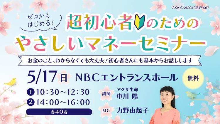 WEB応募フォーム 必要事項をご確認の上、下部にある「送信する」ボタンを押してください。 ゼロからはじめる! 超初心者のためのやさしいマネーセミナー〇〇〇〇〇〇〇〇〇〇〇〇〇〇〇〇〇〇〇〇 「NISA? iDeCo? 周りの人は普通に話しているけど、 いまいちピンとこない…」 「聞くのはちょっと恥ずかしいし、 どうしたらいいのかわからない」 「調べてみたけど、専門用語が多くて 途中で断念…」 そんなあなたのための、知識も予習も無しで、 気軽に参加できるマネーセミナーです。 このセミナーでは 「NISAって何?」 「iDeCoって本当にやらないとダメ?」 「お金のこと、何から始めたらいいの?」 「とにかく損をしたくない! でもどうしたらいいの?」 という超初心者のレベルから 難しい言葉を使わずに、 一つひとつ丁寧にお話しします。 まずは、「知ること」「整理すること」 「自分のペースで考えること」から 始めてみませんか? 「知らなくても大丈夫だった」と 安心して参加できる内容です。 <開催概要> 【 日 時 】 2026年5月17日(日) ①【午前の部】10:30 ~ 12:30 ②【午後の部】14:00 ~ 16:00 【 会 場 】 NBC長崎放送 1階エントランスホール (長崎市尾上町5-6) 【参加費】 無料(要当選メール) 【定 員】 午前・午後 各回 先着40名 (合計80名) ※18歳から69歳までの方におすすめ ※応募者多数の場合は抽選となります。 ご夫婦、お友達同士の参加もOK! お気軽にご参加ください。 【 講 師 】 アクサ生命保険㈱ 福岡FA支社 中川 陽さん 【 司 会 】 NBCテレビ Pintリポーター 力野 由起子 【参加特典】 参加者全員に 東京ミルクチーズ工場 「ソルト&カマンベールクッキー」 をプレゼント! さらにご希望の方には お金のプロ講師による無料の個別相談を お申込みいただけます。 (日程調整して後日実施) 【応募締切】 2026年 5月8日(金)23:59 ※厳正なる抽選の上、当選者へ当選メールを お送り致しますので、当日受付にて 当選メール画面をご提示ください。 ※定員に達した場合は、上記より早く 締め切る場合があります。 【注意事項】 ・1組2名様まで参加可能です。 おひとり参加も大歓迎です。 応募フォームの記入欄にご同行される方の 情報もご入力ください。 同行者の方は、セミナー当日、 当選者(代表者)とご一緒に受付を お願いいたします。 ・18歳から69歳までの方におすすめです。 ・本教室終了後、10分~15分程度、 アンケート等にご協力をいただきます。 また、ご希望の方には無料個別相談の お申込みも承ります。 お気軽にお申込みください。 ・当セミナーにおいて 商品の勧誘はございません。 ・保険会社および、保険代理店、証券会社に お勤めの方、本教室の目的以外の方による 参加は固くお断りしており、 該当の方、同業者の方は主催側の判断で 当日の入場をお断りする場合がございます。 ご了承ください。 ・本教室の録音、録画、写真撮影は ご遠慮ください。 ・会場までの交通費は、お客様自身のご負担 となります。ご了承ください。 ・当選者には、メール・電話等でご連絡 する場合がございます。 【個人情報の取り扱いに関して】 ・本セミナーはアクサ生命保険株式会社の依頼 により、NBC長崎放送が応募の受付を行い、 アクサ生命保険株式会社が開催いたします。 ただし、参加者様の受付登録・参加者情報の 管理についてはNBC長崎放送が責任をもって 行います。 【拡大防止に関してご協力のお願い】 NBC長崎放送では、各種感染症予防・ 拡大防止に細心の注意を払い、 マネーセミナーを開催いたします。 下記を必ずご一読いただき、ご了承のうえ、 当セミナーへのご応募・ご参加を お願いいたします。 ・マスクの着用については 個人の判断に委ねるものとします。 ・発熱・咳・全身痛などの症状がある方、 当日体調に不安のある方は 参加をお控えください。 ・会場内で体調の異変を感じた場合は 講義中でもご遠慮なくお近くのスタッフに お声がけください。 ・会場内への食べ物のお持ち込みは ご遠慮ください。 なお、お飲み物は主催者側で 用意させていただきます。 【 主 催 】アクサ生命保険株式会社 MCVP推進第1部 MCVP第2課 東京都港区白金1‐17‐3 NBFプラチナタワー AXA-C-260310/847-067 【企画協力】NBC長崎放送 ゼロからはじめる!超初心者のためのやさしいマネーセミナー郵便番号(必須)ご住所(必須) 都道府県 北海道 青森県 岩手県 宮城県 秋田県 山形県 福島県 茨城県 栃木県 群馬県 埼玉県 千葉県 東京都 神奈川県 新潟県 富山県 石川県 福井県 山梨県 長野県 岐阜県 静岡県 愛知県 三重県 滋賀県 京都府 大阪府 兵庫県 奈良県 和歌山県 鳥取県 島根県 岡山県 広島県 山口県 徳島県 香川県 愛媛県 高知県 福岡県 佐賀県 長崎県 熊本県 大分県 宮崎県 鹿児島県 沖縄県 市町村 長崎市 佐世保市 島原市 諫早市 大村市 平戸市 松浦市 対馬市 壱岐市 五島市 西海市 雲仙市 南島原市 長与町 時津町 東彼杵町 川棚町 波佐見町 小値賀町 佐々町 新上五島町 氏名(必須)フリガナ<氏名>(必須)年齢(必須)0歳1歳2歳3歳4歳5歳6歳7歳8